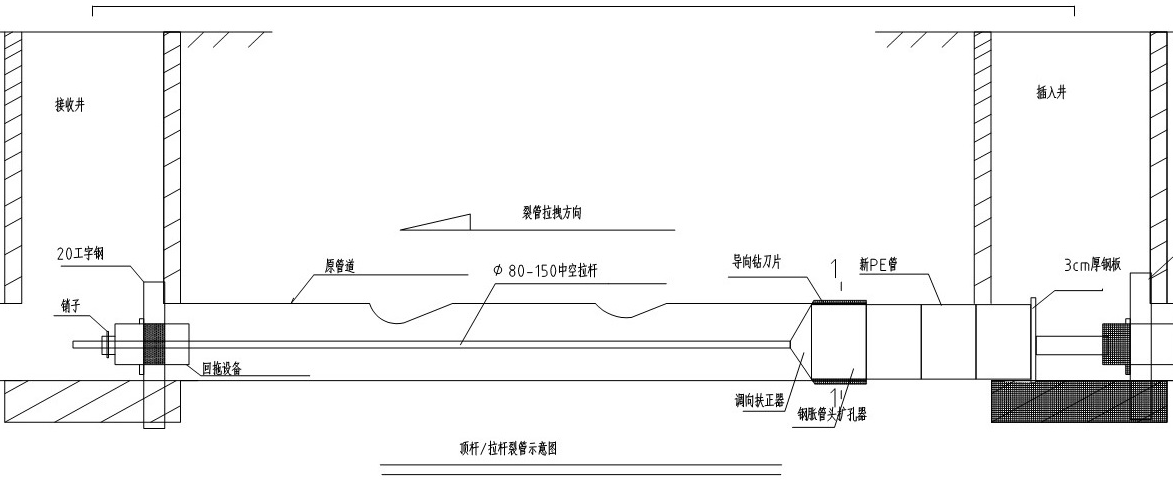 在導(dǎo)向拉桿回拖過程中,調(diào)向扶正器、導(dǎo)向鉆刀片、鋼脹管頭擴(kuò)孔器處于管道前端,起到劃開舊管道,“開路”,的作用,在擴(kuò)孔器的尾端連接戶PE管道,擴(kuò)孔器的直徑要比舊管道的內(nèi)徑略大一些,并且要比新管道的外徑要稍微大些,以便減少新管道進(jìn)入的摩擦力,并且為頂進(jìn)新管道留下一定的余地。同時,在擴(kuò)孔器的尾端緊挨著新管道節(jié)段,新管道節(jié)段緊隨擠擴(kuò)頭回拖。在導(dǎo)向拉桿的拖拉作用下擴(kuò)孔器、新管道依次從插入并進(jìn)入空腔并逐步向前推進(jìn),最終將整條管道更換。