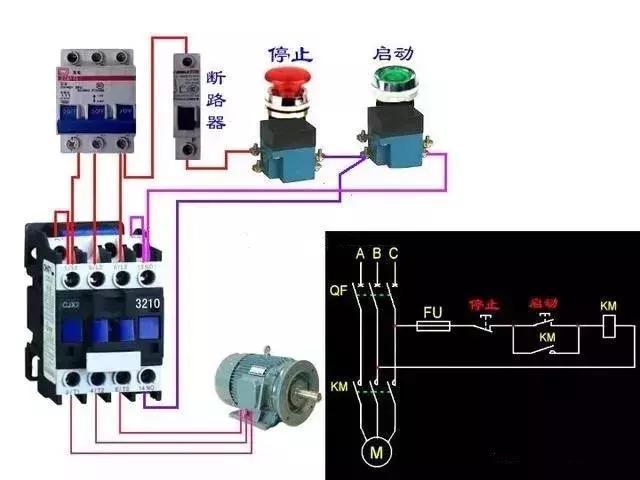 明白了實(shí)物接線以后我們?cè)倏措娐穲D就很容易理解了,右方是接觸器自鎖電路圖,ABC分別電表三相火線電源,QF開(kāi)關(guān),KM是接觸器,F(xiàn)U是熔斷器,KM帶個(gè)方口就是接觸器線圈電源,按鈕的位置,連在一起的是要接常閉,分開(kāi)的是要接常開(kāi),圓圈M 是負(fù)載電動(dòng)機(jī),根據(jù)實(shí)物接線圖再結(jié)合自鎖電路圖!