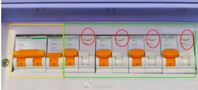 ▲如圖所示,紅色圈圈出來的就是漏保多的按鈕,綠色框線的四個(gè)支線安裝的是漏保,而黃色框線里的照明線路和總閘都是空開。