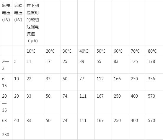 變壓器直流耐壓時(shí)泄漏電流與環(huán)境溫度對應(yīng)的泄漏電流見表