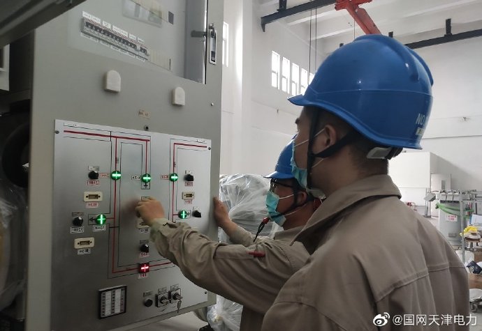 5月25日,天津送變電員工秦勤、郭志君在交流220千伏海河下游變電站傳動110kV分段開關(guān),確保設(shè)備正常運行。 ????