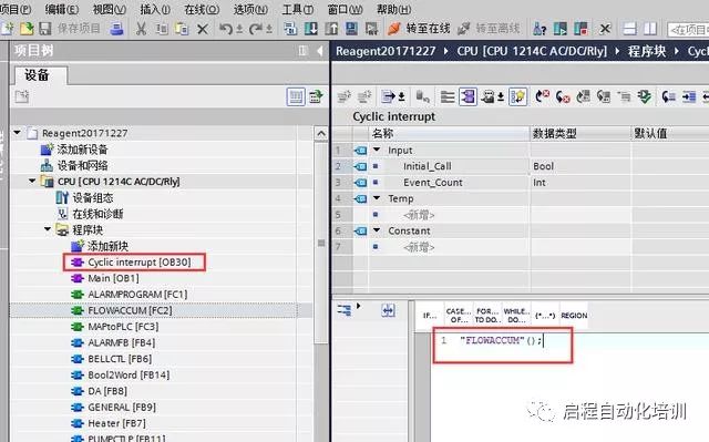 雙擊循環(huán)中斷OB30中斷塊,在中斷塊中調(diào)用FC2(FLOWACCUM)功能塊,如下圖所示