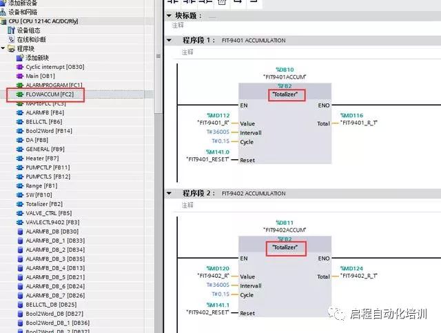 第四步:在FC中調(diào)用名字為“Totalizer”的FB塊,并對(duì)輸入輸出參數(shù)賦值,如下圖所示