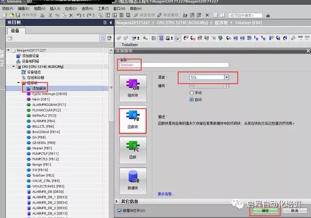 第一步:在程序塊目錄下單擊添加新塊,彈出添加新塊對(duì)話框,選中FB函數(shù)塊,在名稱欄填上需要命名的名字,如:Totalizer,選擇編程需要用的編程語(yǔ)言,本文以SCL語(yǔ)言講解,F(xiàn)B塊的編號(hào)可以通過(guò)手動(dòng)或自動(dòng)生成,然后單擊確認(rèn),如下圖所示