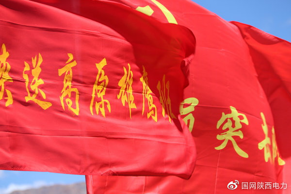 陜西送變電現(xiàn)場向黨員突擊隊授旗:攻堅克難,不辱使命。向青年突擊隊授旗:黨員引領,齊頭并進。洛桑達娃向堅守在高原的施工班組授受“陜送高原雄鷹班”的旗幟:陜送雄鷹,高原展翅。