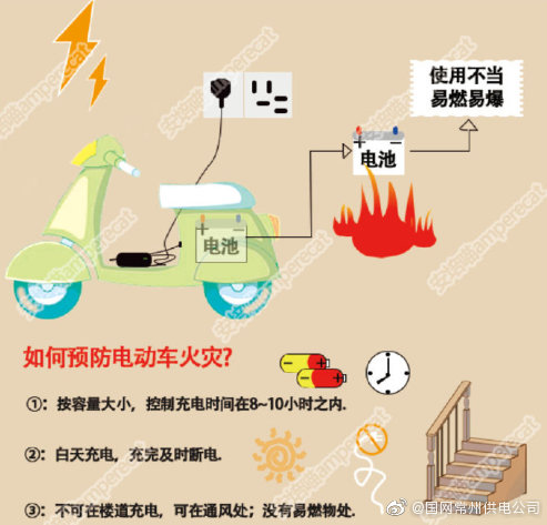 【預防電動車火災 正確充電是關鍵】近年來,全國各地頻繁發(fā)生電動車起火事故,造成財產(chǎn)損失和人員傷亡。如何預防電動車火災,按照電瓶容量大小的不同,一般在8-10小時內(nèi)就能充滿;盡量在白天充電,充電后一定要及時斷電;別在樓道內(nèi)充電,充電時請通風,最佳環(huán)境溫度是25℃。