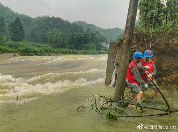 7月6日,崇陽地區(qū)暴雨普降,崇陽縣港口鄉(xiāng)油榨村有兩根高壓電桿被河水沖倒,導(dǎo)致油榨村、石嶺村、2500余戶居民停電。國網(wǎng)崇陽縣供電公司10余名“跑山電工”立即出動,在最短時間新立兩根電桿,重新架設(shè)兩檔10千伏導(dǎo)線,為村民恢復(fù)供電.