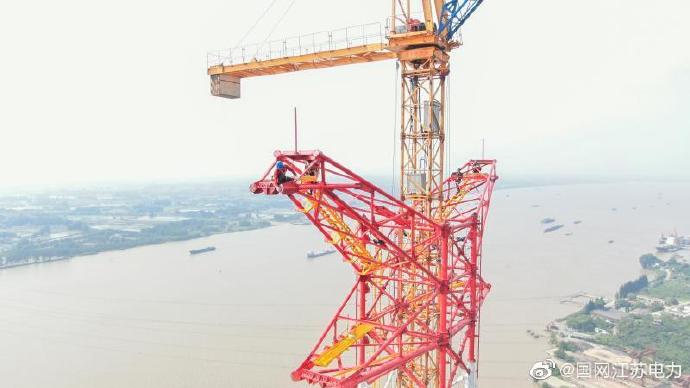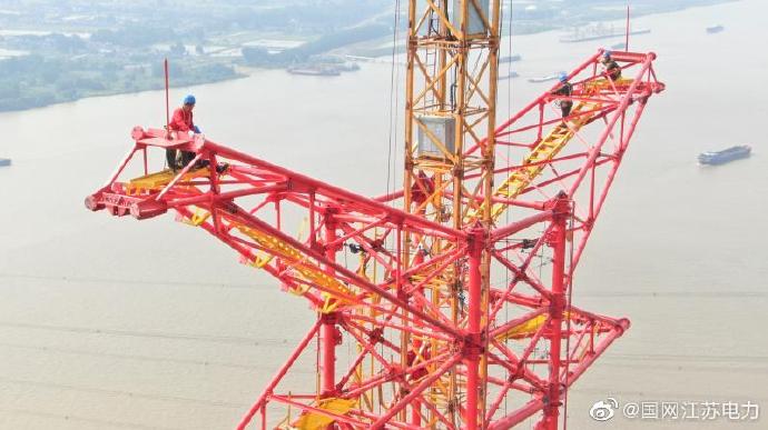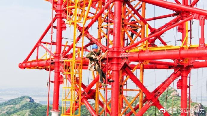 6月24日,在鎮(zhèn)江五峰山220千伏跨江升高改造工程南跨越塔舊塔爆破原址,江蘇省送變電有限公司施工人員正在162米的高空組裝新鐵塔。隨著最后一吊地線頂架完成組裝,標(biāo)志著南跨越塔全部組裝完成。新建跨江輸電線路建設(shè)后將滿足現(xiàn)今長江干線5萬噸級海輪遠(yuǎn)航凈高50米的要求,輸電能力也較原來提升3倍以上。