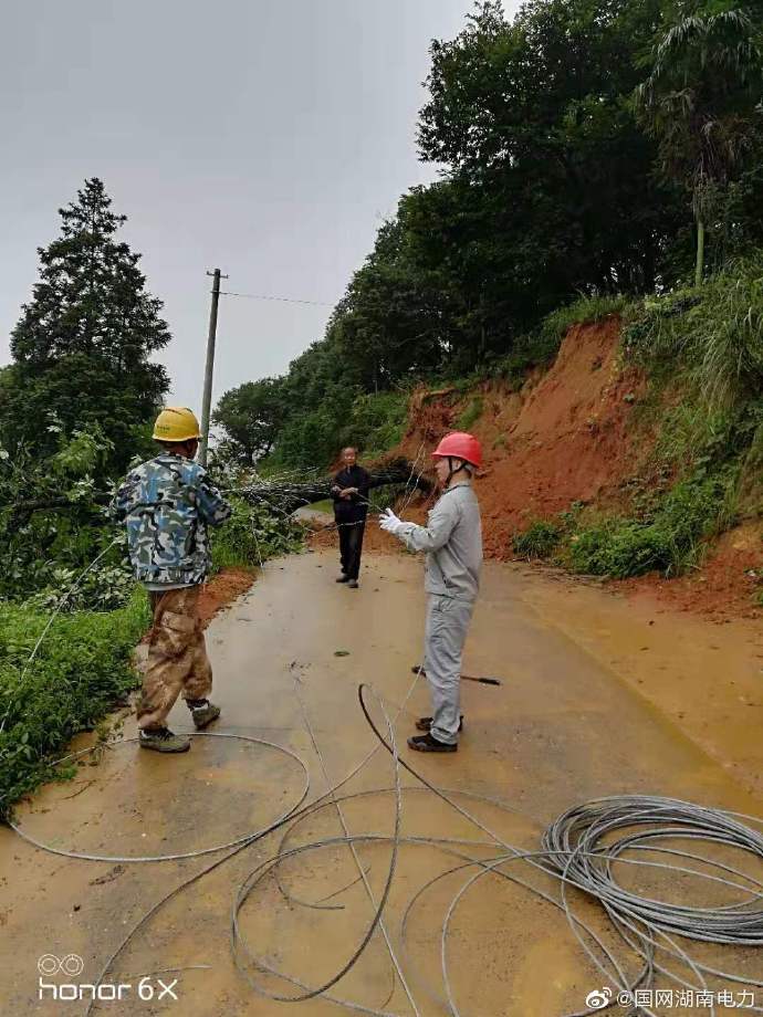 湖南連續(xù)遭遇暴雨天氣,導(dǎo)致山體滑坡,百年大樹(shù)被連根拔起壓斷電力線路,國(guó)網(wǎng)新寧電力公司馬上組織員工進(jìn)行搶修,保證電力供應(yīng)。