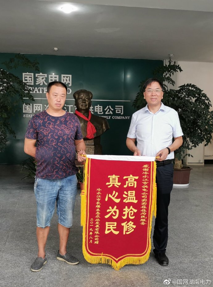8月19日,國網(wǎng)冷水江市供電公司鐸山供電所工作人員頂著炎炎烈日對王家村的停電故障快速搶修恢復(fù)送電,群眾的生產(chǎn)、生活用電均得到保障,客戶自發(fā)送來“高溫?fù)屝?真心為民”的錦旗表示感謝。