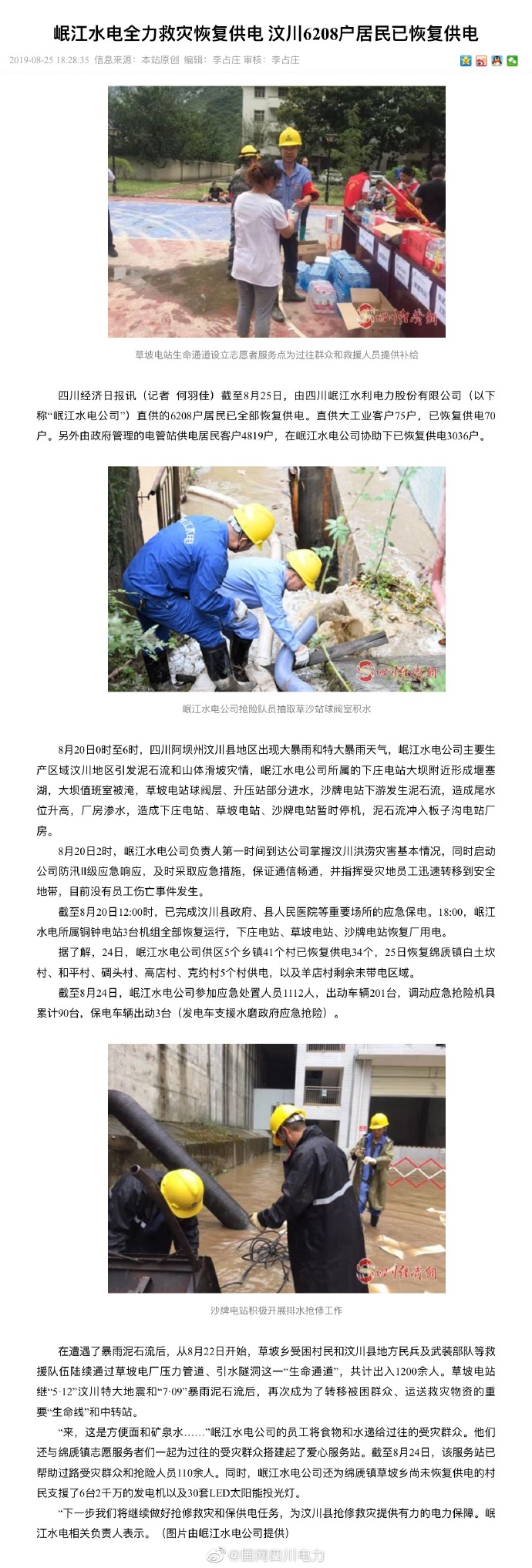 四川岷江水利電力股份有限公司全力救災(zāi) 恢復(fù)6208戶汶川居民供電