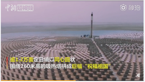 【震撼!戈壁灘上1.2萬(wàn)面定日鏡拼出巨幅祝福祖國(guó)】近日,甘肅敦煌100兆瓦熔鹽塔式光熱發(fā)電站場(chǎng)區(qū)內(nèi),逾1.2萬(wàn)面定日鏡,以同心圓狀圍繞260米高的吸熱塔,拼成巨幅“祝福祖國(guó)”!據(jù)悉,這是全球聚光規(guī)模最大、可24小時(shí)連續(xù)發(fā)電的100兆瓦級(jí)熔鹽塔式光熱電站。網(wǎng)友:祝福我的祖國(guó),為阿中哥打CALL!