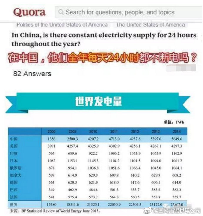 有位印度網(wǎng)友在外國知乎發(fā)問“中國全年24小時都不斷電嗎”?網(wǎng)友表示“好久沒體驗停電的感覺了”。隨著國家電網(wǎng)積極建設(shè)及西電東送、南北互供等,全國聯(lián)網(wǎng)格局基本形成,連續(xù)超越發(fā)達國家,2011年發(fā)電就成為了世界第一