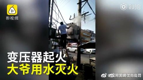 日前,某縣市一變壓器著火,大爺爬梯子用鐵瓢舀水往火上澆。大爺說,他家離這近,怕火大了跟著燒起來。這種做法太危險(xiǎn)?。?!萬一遇到類似情況,請立即撥打國網(wǎng)供電公司客服電話95598,并立即報(bào)警! ????