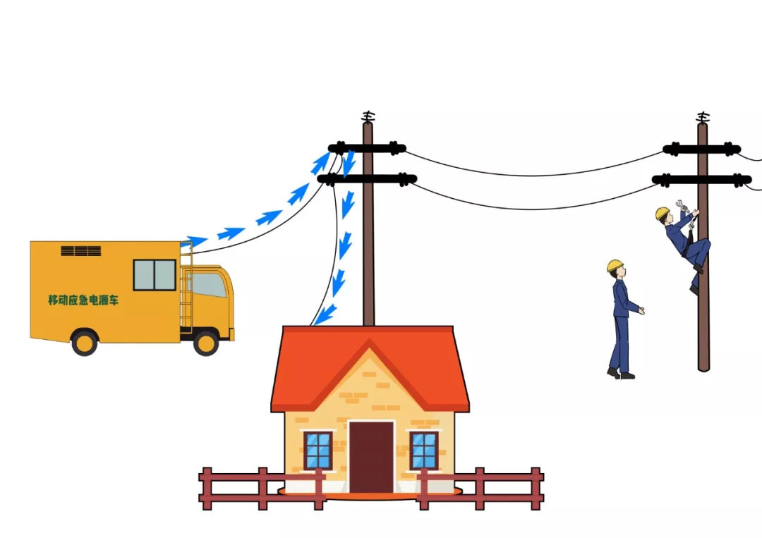 當(dāng)小e家的電源A線路需要停電檢修,卻還沒有實(shí)現(xiàn)“手拉手”供電時(shí),一輛移動(dòng)電源車會(huì)開到附近,臨時(shí)充當(dāng)“B線路”角色為小e的家供電。