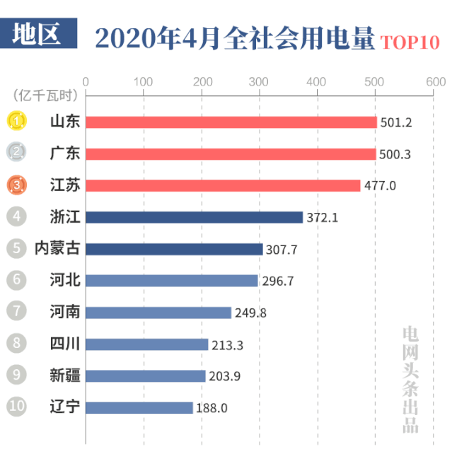 2020年4月份,山東、廣東和江蘇的全社會(huì)用電量位列全國(guó)前三甲,分別為501.2 億千瓦時(shí)、500.3億千瓦時(shí)和477.0 億千瓦時(shí)。