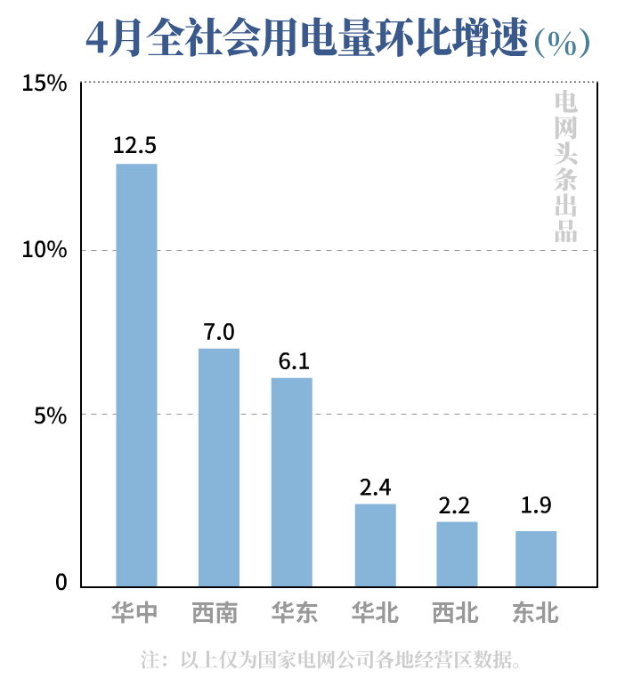 與3月份相比,華中、西南、華東、華北、西北、東北區(qū)域全社會(huì)用電量增速分別回升12.5、7.0、6.1、2.4、2.2、1.9個(gè)百分點(diǎn)。