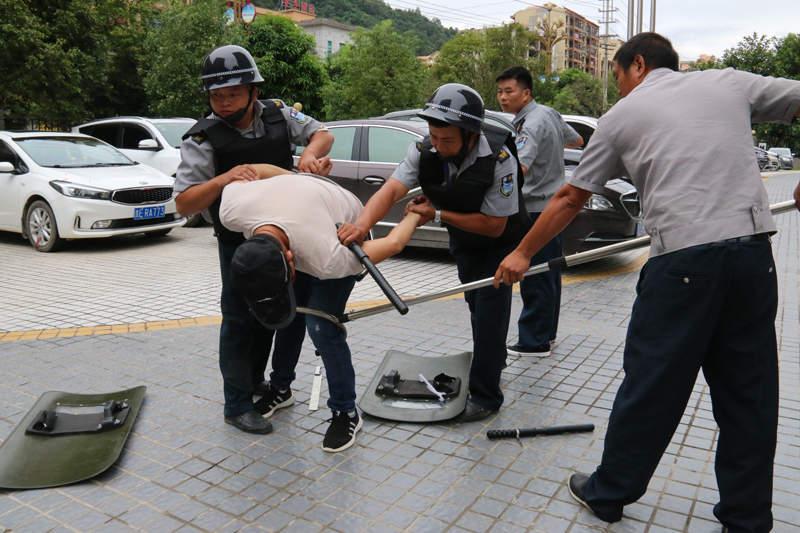 9月18日上午11時許,“突發(fā)性恐怖襲擊”演練正式開始。按照預(yù)設(shè)情景,三名來勢洶洶的“歹徒”手持刀具、燃燒瓶,強行沖進生產(chǎn)調(diào)度綜合樓準備實施破壞,襲擊保安和工作人員。大樓保安人員快速反應(yīng),迅速啟動應(yīng)急預(yù)案,應(yīng)急分隊成員手持警棍、鋼叉與暴恐分子周旋、搏斗,尋找適當機會制服暴恐分子。最終通過團隊協(xié)作成功將“歹徒”制服。