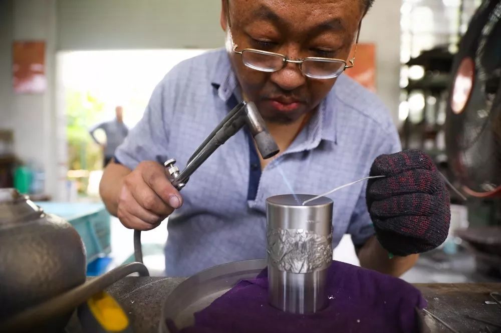 從頭到尾,一把錫壺要經(jīng)過打磨、熔化、壓片、裁料、造型、捶打、刮光、焊接、擦亮、鏨花、雕刻、嵌銅裝飾等17道工序,至少捶打10萬次才能成品。