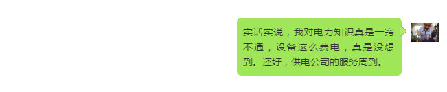 實話實說,我對電力知識真是一竅不通,設(shè)備這么費電,真是沒想到。還好,供電公司的服務(wù)周到。