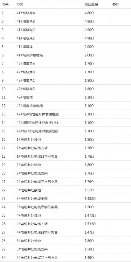 1)、對41#鐵塔、42#鐵塔、電纜溝道接地電阻進(jìn)行測試,測試結(jié)果<10Ω,符合要求。測試數(shù)據(jù)為: