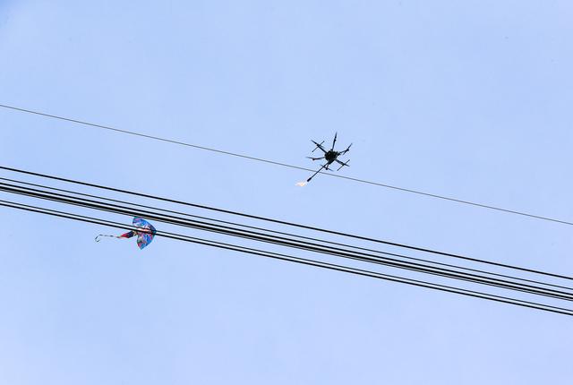確定環(huán)境、加滿汽油、噴射作業(yè)……當天下午1點整,經(jīng)過了幾次嘗試和加注汽油,無人機慢慢靠近纏繞在馬界線的風箏,空中噴射的火焰燒斷了牽引線。百米風箏掉落在田野間,避免了一場大面積跳閘事故。